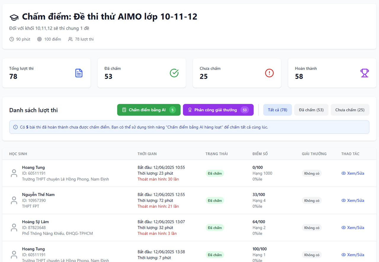 Nhằm đảm bảo sự công bằng tuyệt đối, ngày diễn ra vòng thi sơ loại (22/6/2025), nền tảng Aiducation sẽ tạm ngưng chức năng hỗ trợ học tập thường ngày. Đồng thời, công nghệ chống gian lận sẽ được kích hoạt, cho phép ban tổ chức và quản trị viên theo dõi màn hình làm bài, hạn chế tối đa khả năng gian lận, tạo ra môi trường thi cử minh bạch, công bằng và chất lượng.