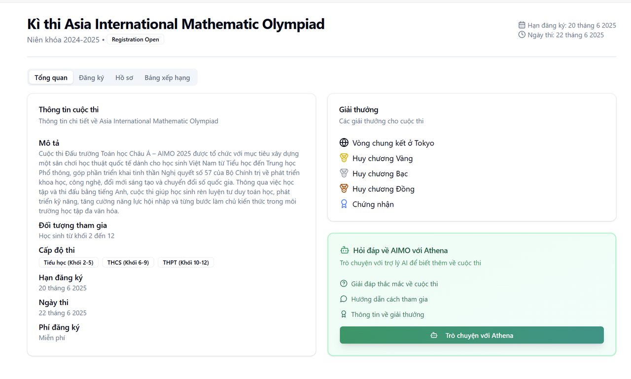 Bên cạnh đó nền tảng hỗ trợ công cụ Voice AI phụ huynh có thể trò chuyện trực tiếp hai chiều với Voice AI thông tin về cuộc thi AIMO.