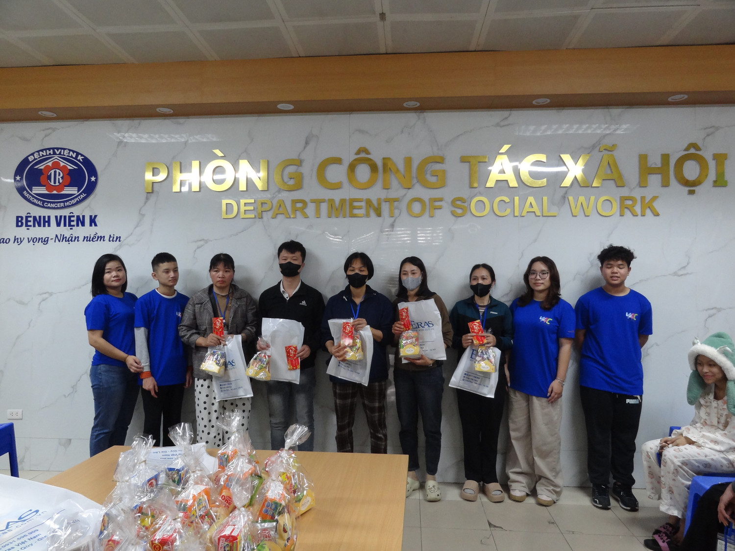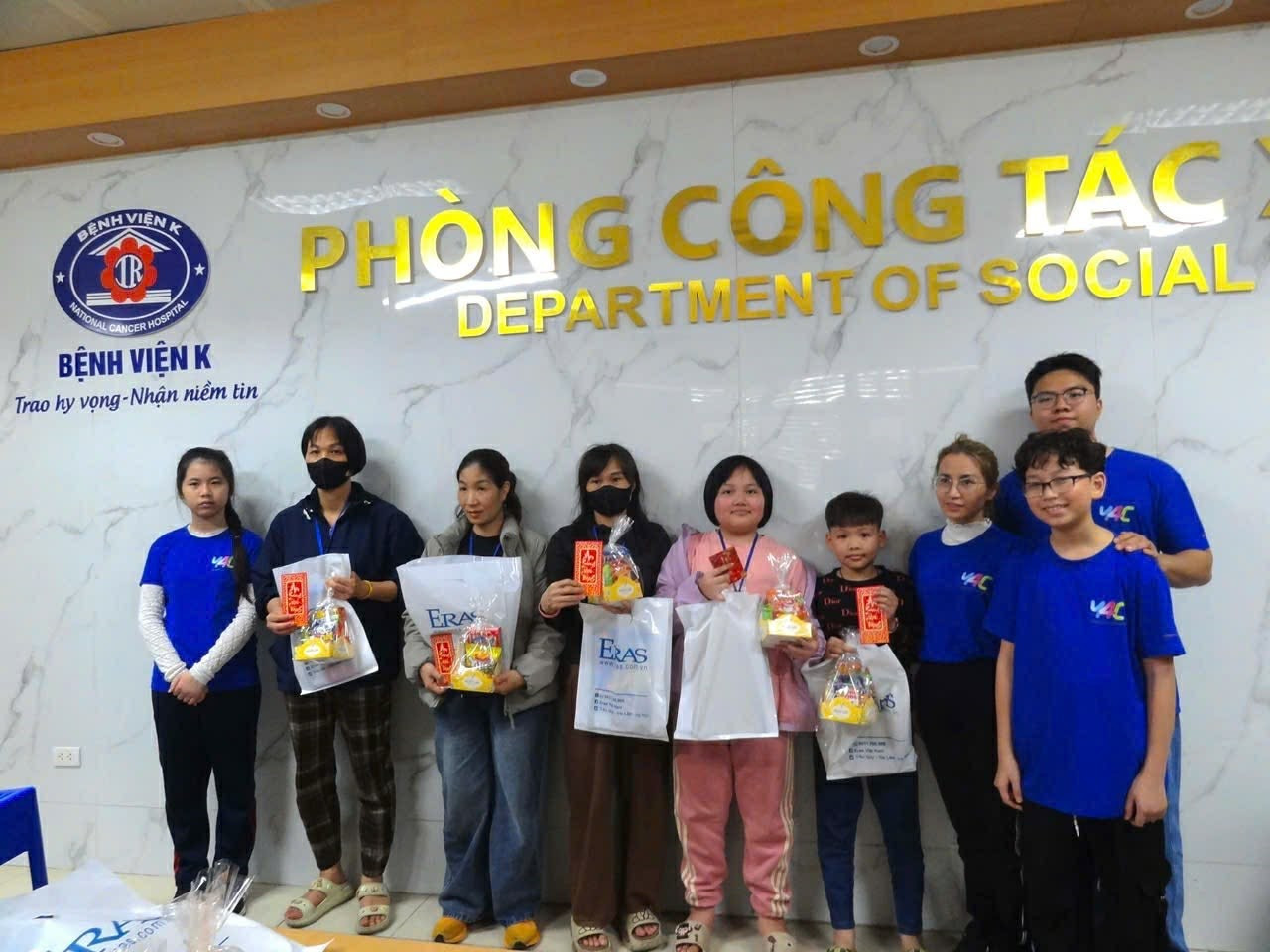 Tiếp nối hoạt động tại Ninh Bình, ngày 13/2, với sự ủng hộ của nhiều tập thể, cá nhân và đặc biệt là sự tài trợ từ nhãn hàng Eras, Y4C đã trao 30 suất quà tới gia đình các em nhỏ đang điều trị tại Khoa Nhi – Bệnh viện K Tân Triều (Hà Nội) thông qua chương trình “Mang Tết cho em”.